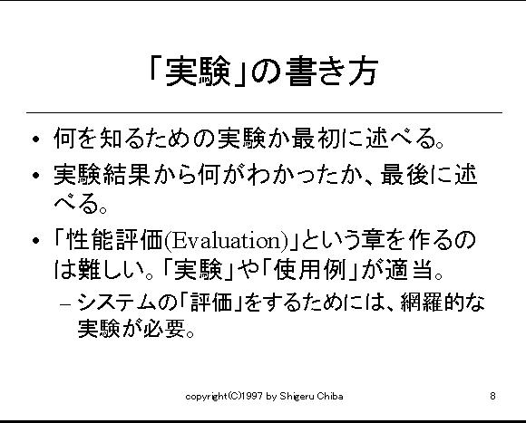 多くの人が性能評価だと思っている実験は、しばしば、性能評価のために必要な多くの実験のうちの一つに過ぎない。ときには、性能評価をするために必要な実験ですらなく、単にそのシステムの使用例であることもある。例えば、拡張可能なファイルシステムを拡張して、ファイルのロックの速度を改善したら、それはそのシステムのひとつの拡張例である。ロックが速くなったことを示す実験は、その拡張例の性能を評価するための一連の実験のひとつである。けして拡張可能なファイルシステムの性能を評価するための実験ではない。