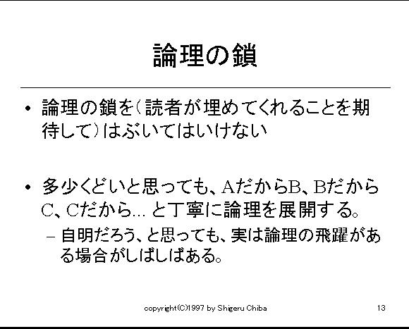 「理科系の作文技術」によると、とくに英語では論理の鎖を省いてはいけないそうである。明白でないより、くどい方をよしとするのが英語だそうだ。一方、日本語では、多少わかりにくくても、多くを語らない奥ゆかしさが尊ばれる。だが、論文を書いているときには、この奥ゆかしさは忘れたほうがよい。